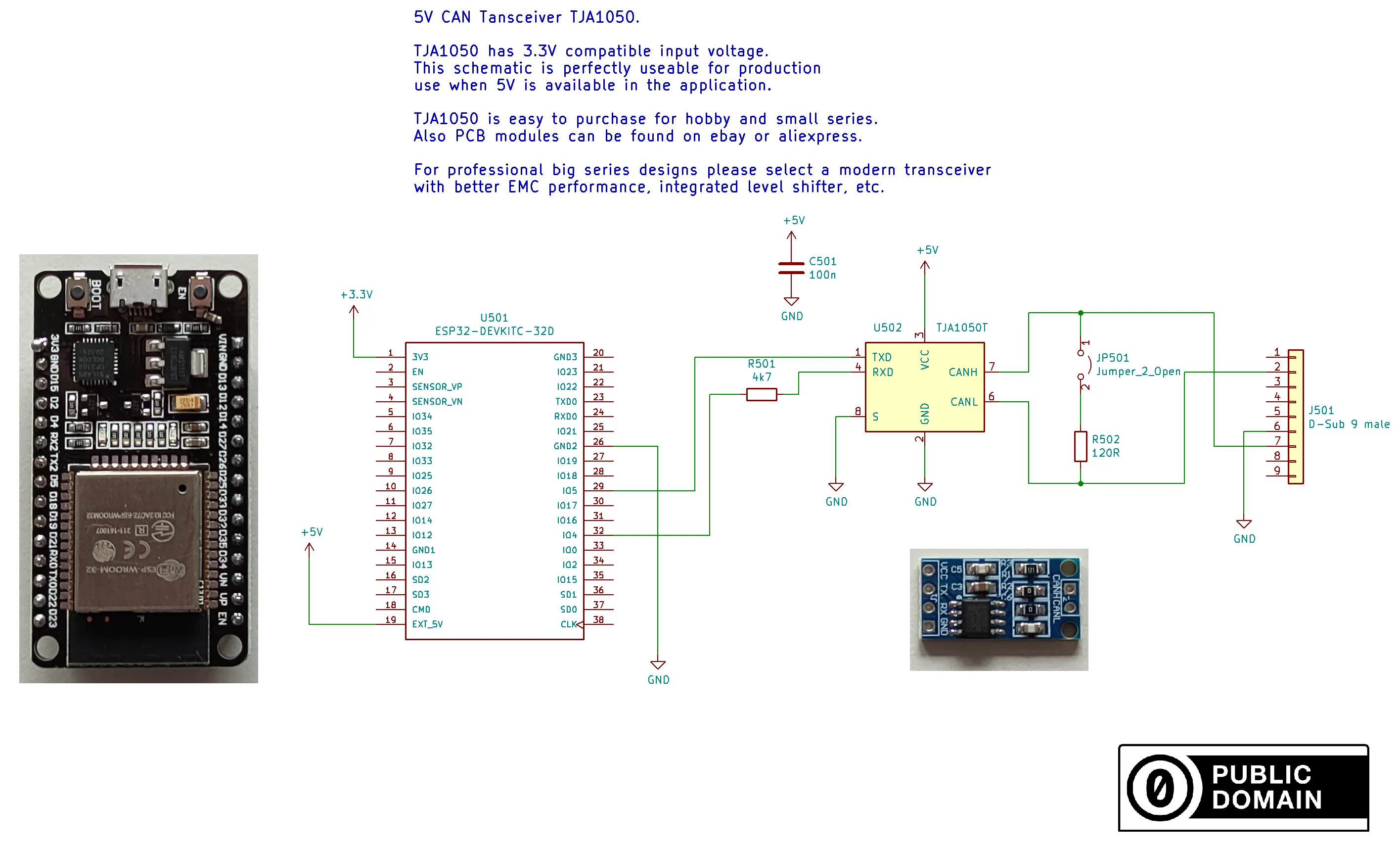 Section titled “Wiring options”5V CAN transceivers are cheap and generate compliant levels. If you power your board with 5V this is the preferred option. R501 is important to reduce the 5V logic level down to 3.3V, to avoid damaging the ESP32. You can alternatively use a voltage divider here instead.